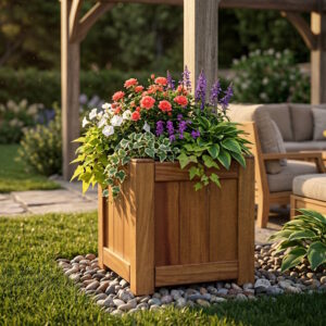 Crafted from premium Iroko hardwood, this square wooden garden planter combines durability with natural elegance.